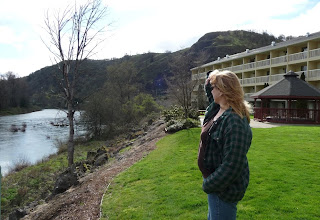 We arrived in Roseburg about 3:00 and checked in at the Holiday Inn Express. I would highly recommend this hotel if you ever find yourself needing a room in the vicinity. Dogs are welcome in the first floor rooms. Our back door opened onto a nice green lawn with the beautiful Umpqua river just beyond. The indoor pool, jacuzzi, and fitness room were excellent. The free breakfast was a lot more than coffee and donuts, with cheese omelets, bacon, toast, yogurt and fresh fruit. A good value and nice clean rooms.